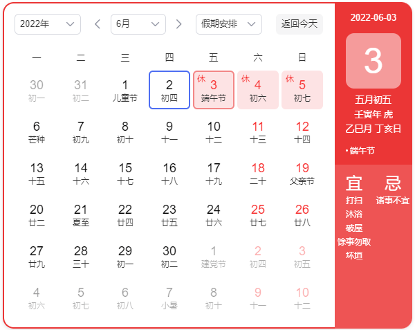 依據(jù)國務院發(fā)布的2022年放假安排,2022年06月03日至06月05日止,06月6日(星期一)正常上班。