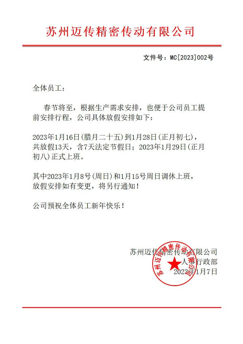 蘇州邁傳減速電機(jī)廠2023年春節(jié)放假通知